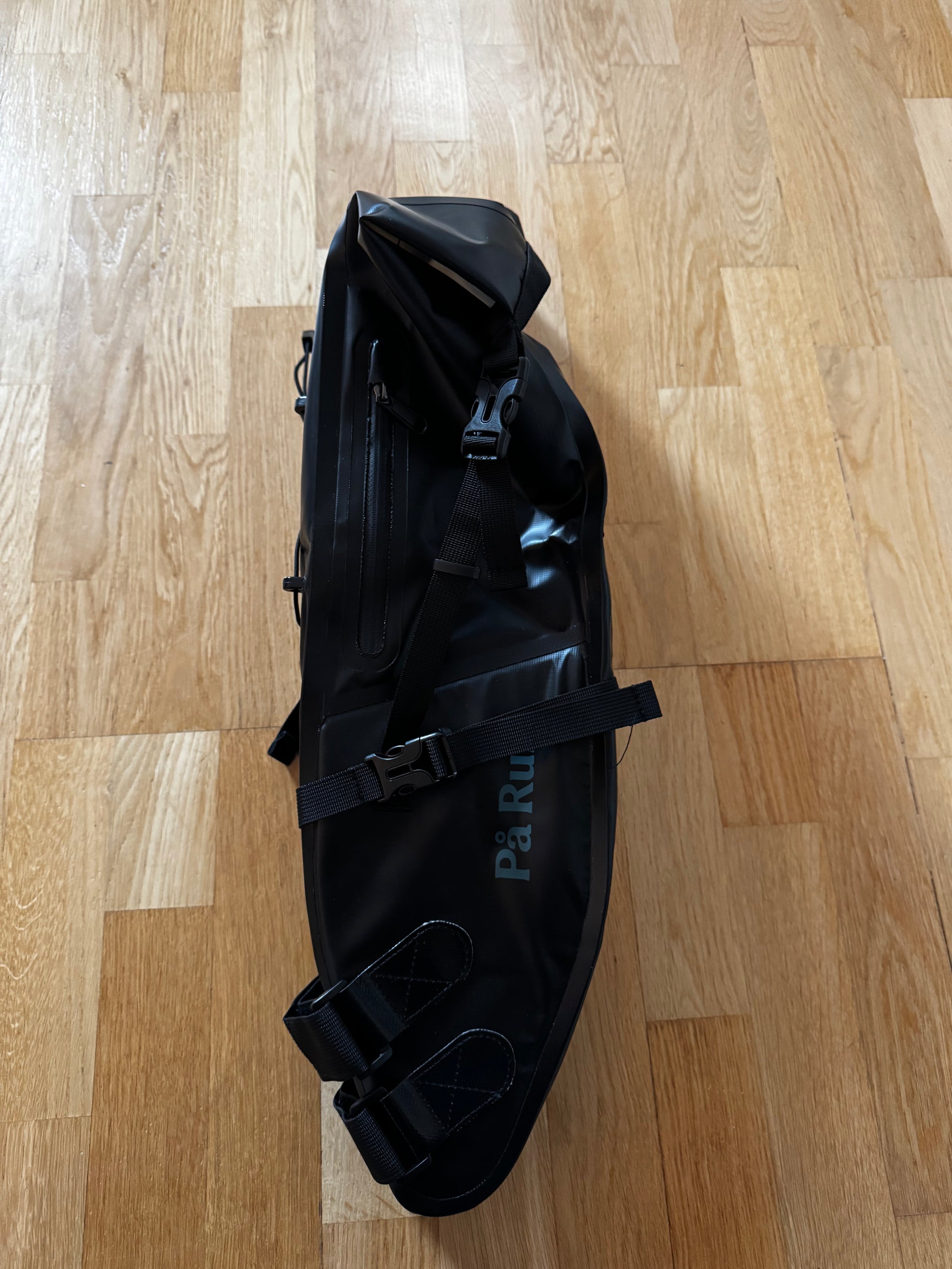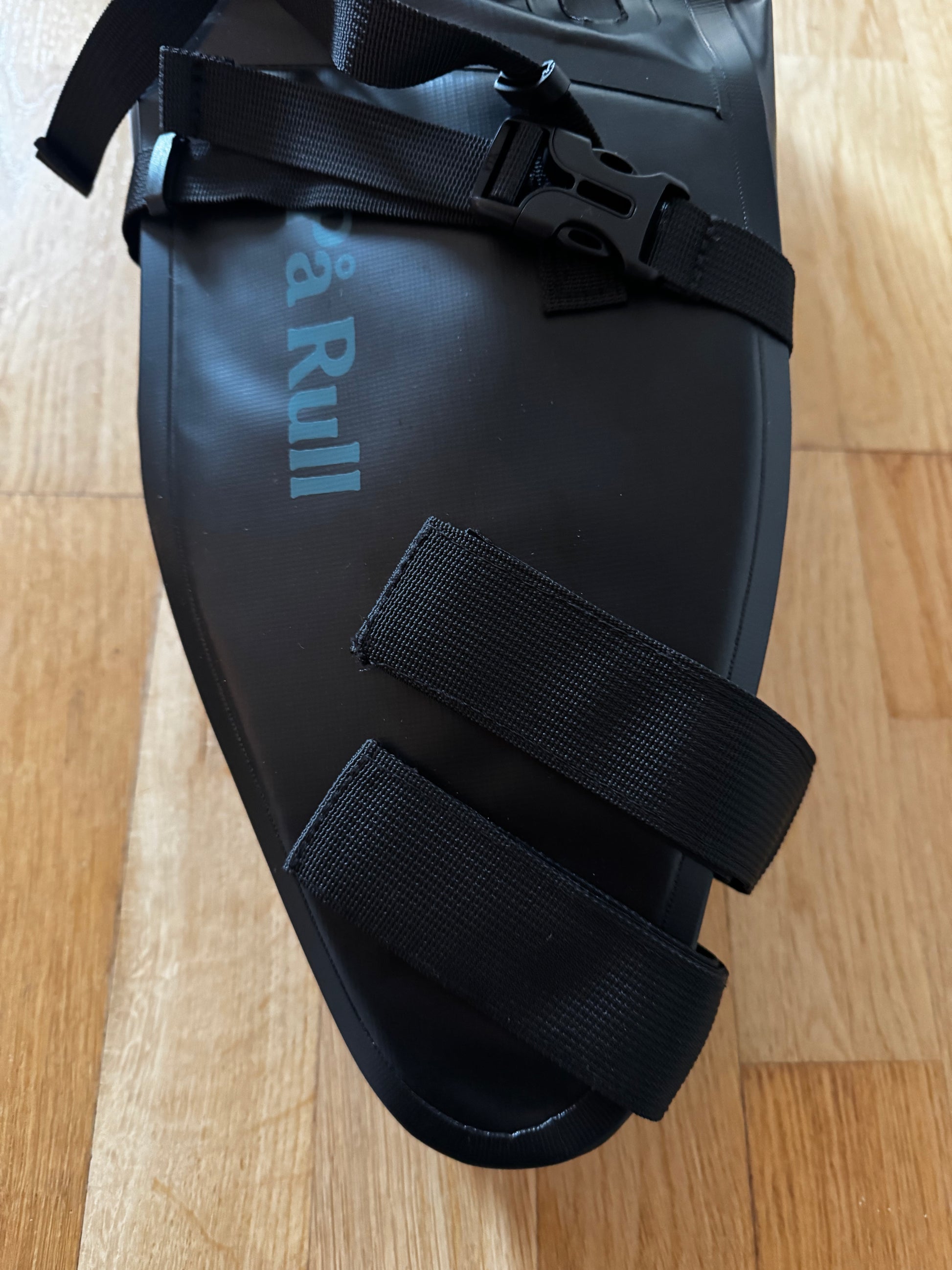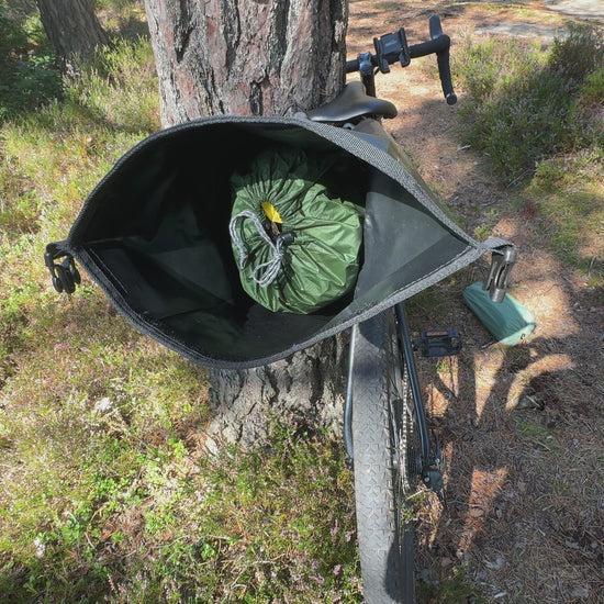 Rullstängning och PVC-belagt yttertyg skyddar effektivt mot regn, smuts och stänk under cykelturen. För längre äventyr i riktigt blöta förhållanden rekommenderar vi att packa innehållet i en vattentät innersäck för extra skydd.
